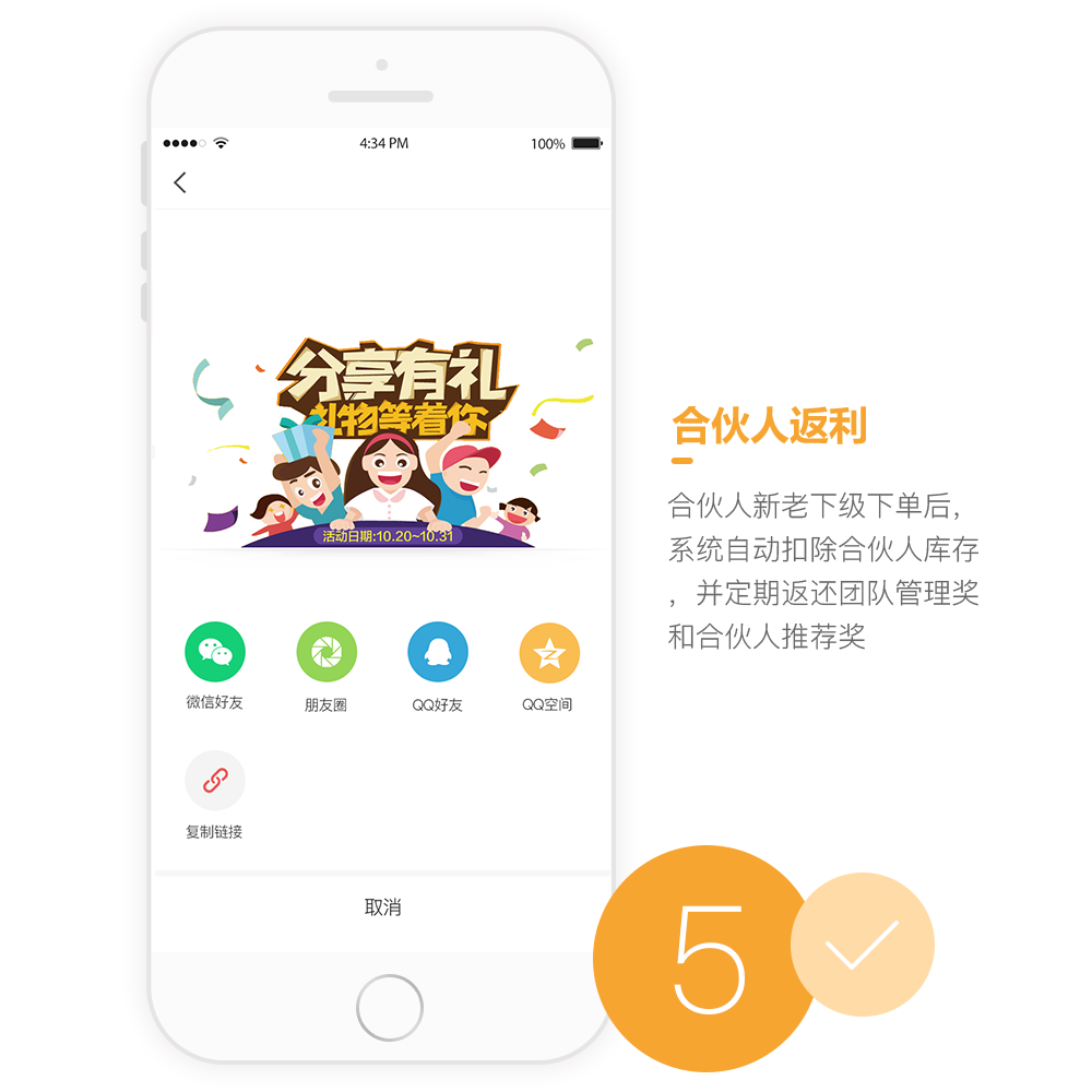 合伙人可發(fā)展下級,用戶下單后,系統(tǒng)自動扣除合伙人庫存,并返還對應(yīng)的折扣差價和獲得團隊獎勵