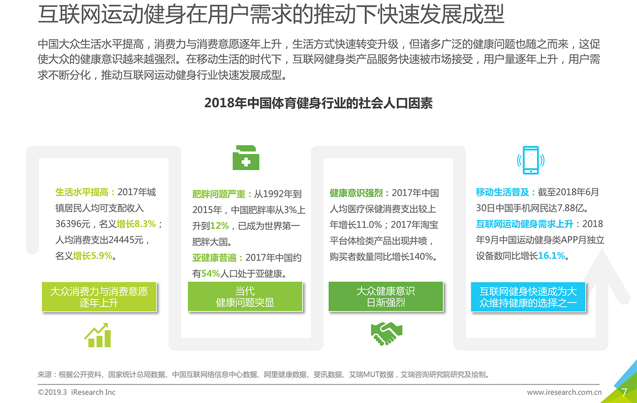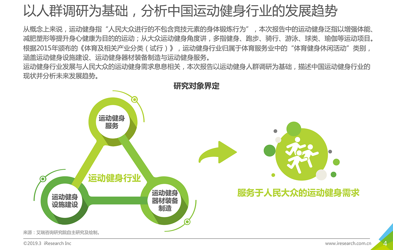 報告下載? ?運(yùn)動健身行業(yè)在政策鼓勵,大眾生活水平提升,健康意識提高的背景下,整體發(fā)展向好。2018年,傳統(tǒng)健身企業(yè)發(fā)展相對穩(wěn)定,資本看好穩(wěn)健型運(yùn)動健身企業(yè)以及結(jié)合智能科技元素的新型運(yùn)動健身企業(yè)。本報告以運(yùn)動健身行業(yè)作為主要研究對象,描述并探討運(yùn)動健身行業(yè)發(fā)展背景、現(xiàn)狀特點(diǎn)、產(chǎn)業(yè)鏈、商業(yè)模式,通過對運(yùn)動健身人群的深入調(diào)研,探索其對運(yùn)動健身場景、服裝設(shè)備、課程服務(wù)的服務(wù)需求,為未來行業(yè)服務(wù)升級提供發(fā)展建議。
